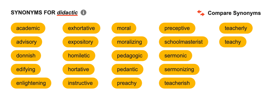“Didactic,” something that teaches a lesson. I’ve said that “didactic,” was my favorite word for years. and there are people who will verify this. I’ve been a teacher forever, I can only deny so many things. I just looked up a bunch of synonyms for it in Thesaurus.com…